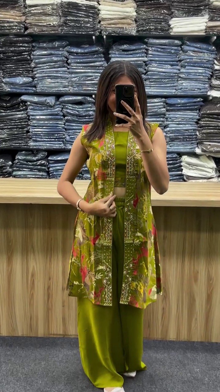 This trendy co-ord-set features a sleeveless inner top, wide-leg pants,and a long printed jacket with ethnic-style embroidered borders 💗🌺
